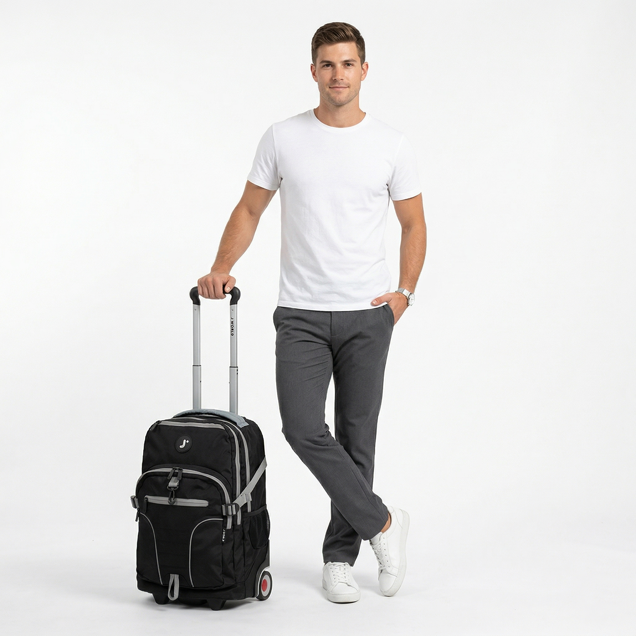 The perfect travel companion, this durable wheeled backpack combines functionality and safety. Lunar Laptop Rolling Backpack features a padded sleeve that fits up to a 15.4-inch laptop and a front pocket organizer with a pencil holder, key fob, and zipper pocket for easy access to your essentials. Designed to fit under airplane seats or in overhead compartments, it includes adjustable compression straps, soft, noiseless wheels, and reflective accents for night safety. Whether for school, work, or travel, this backpack offers a hassle-free, organized experience.