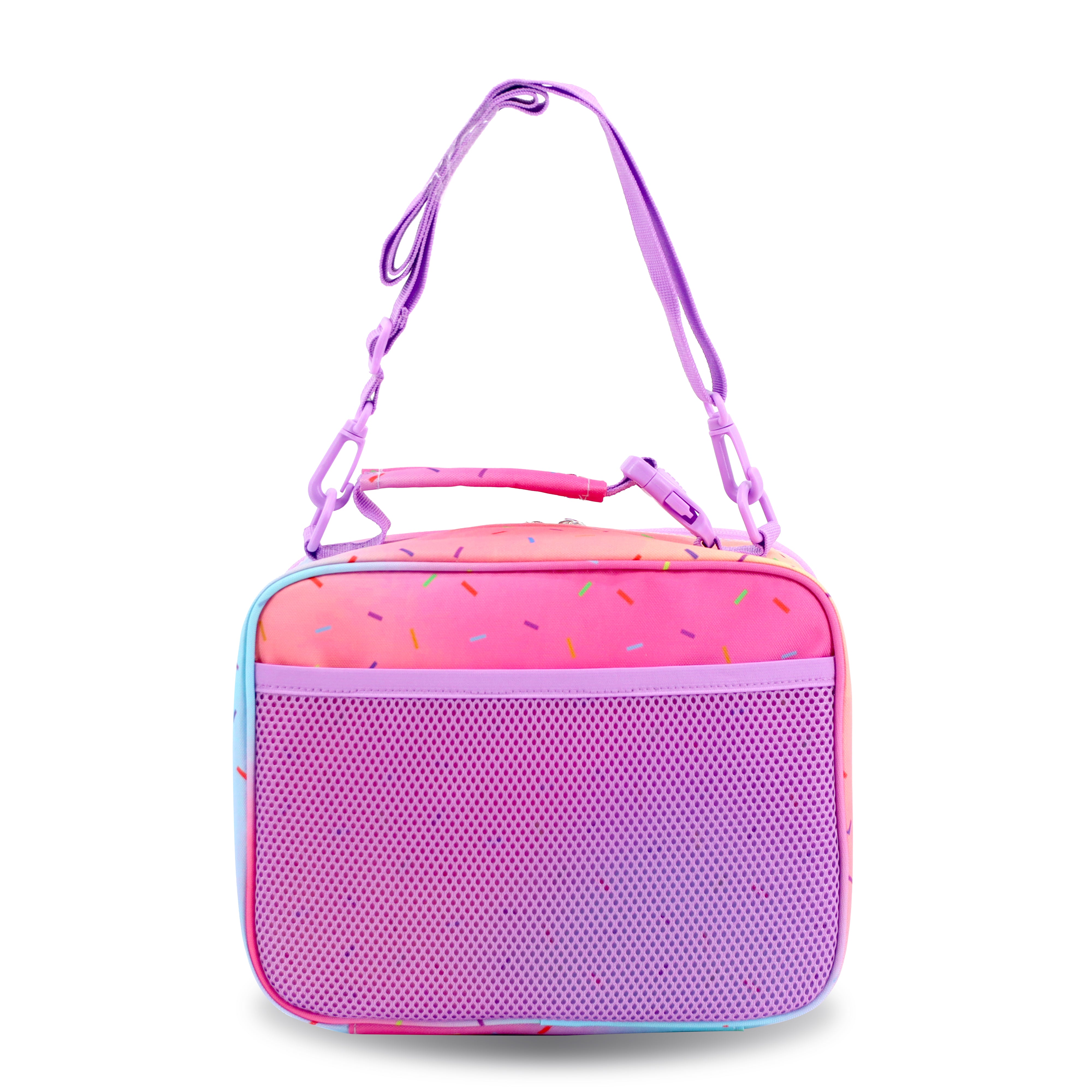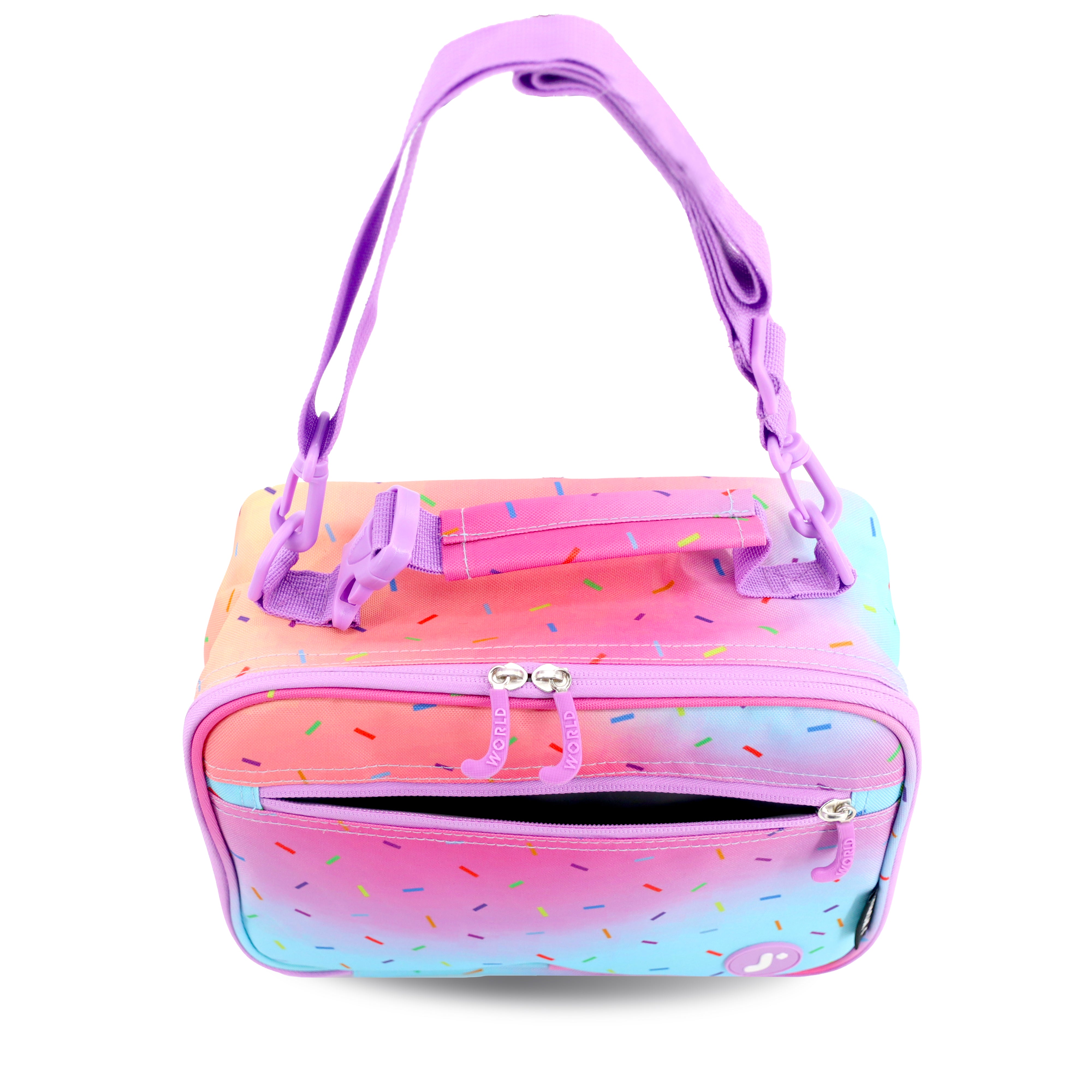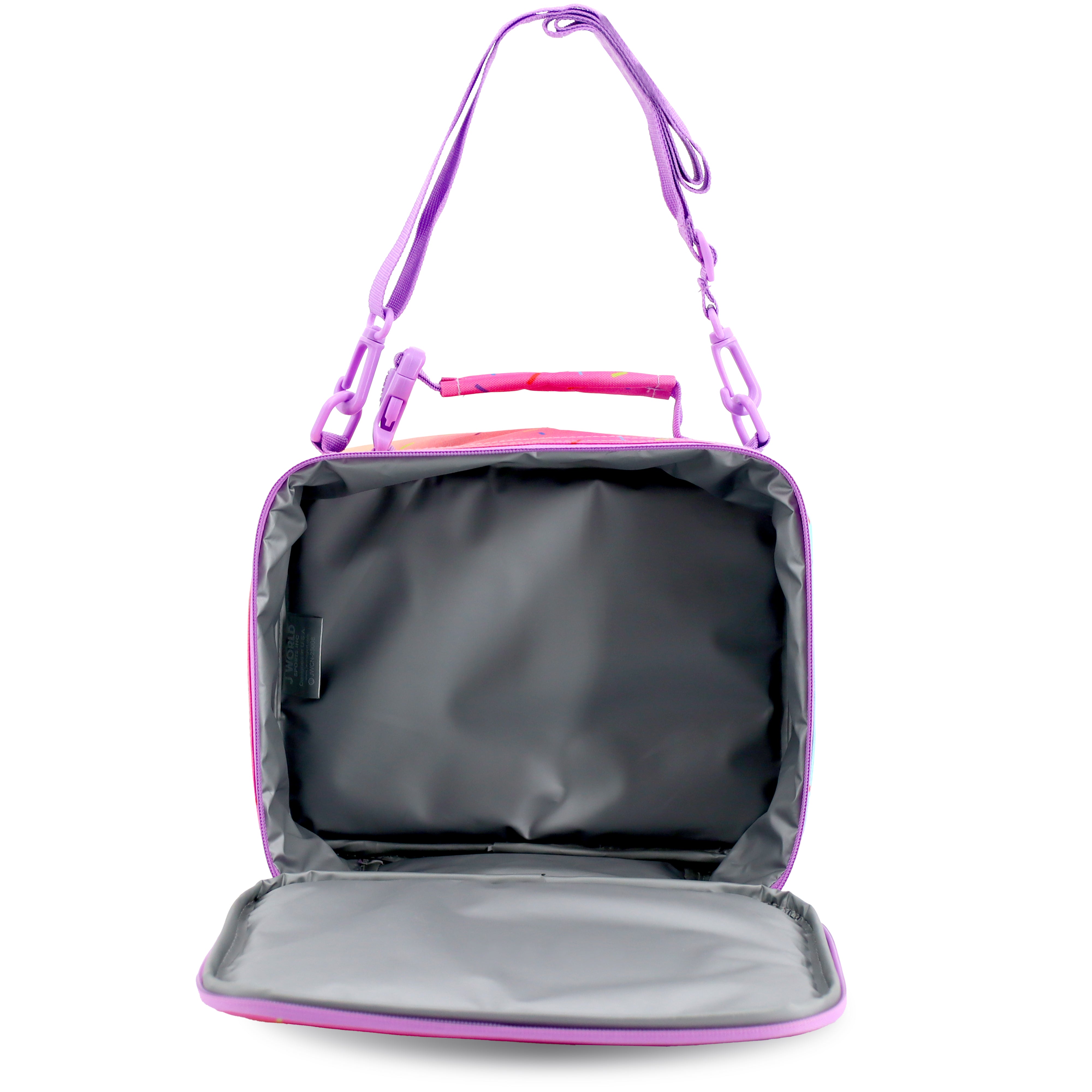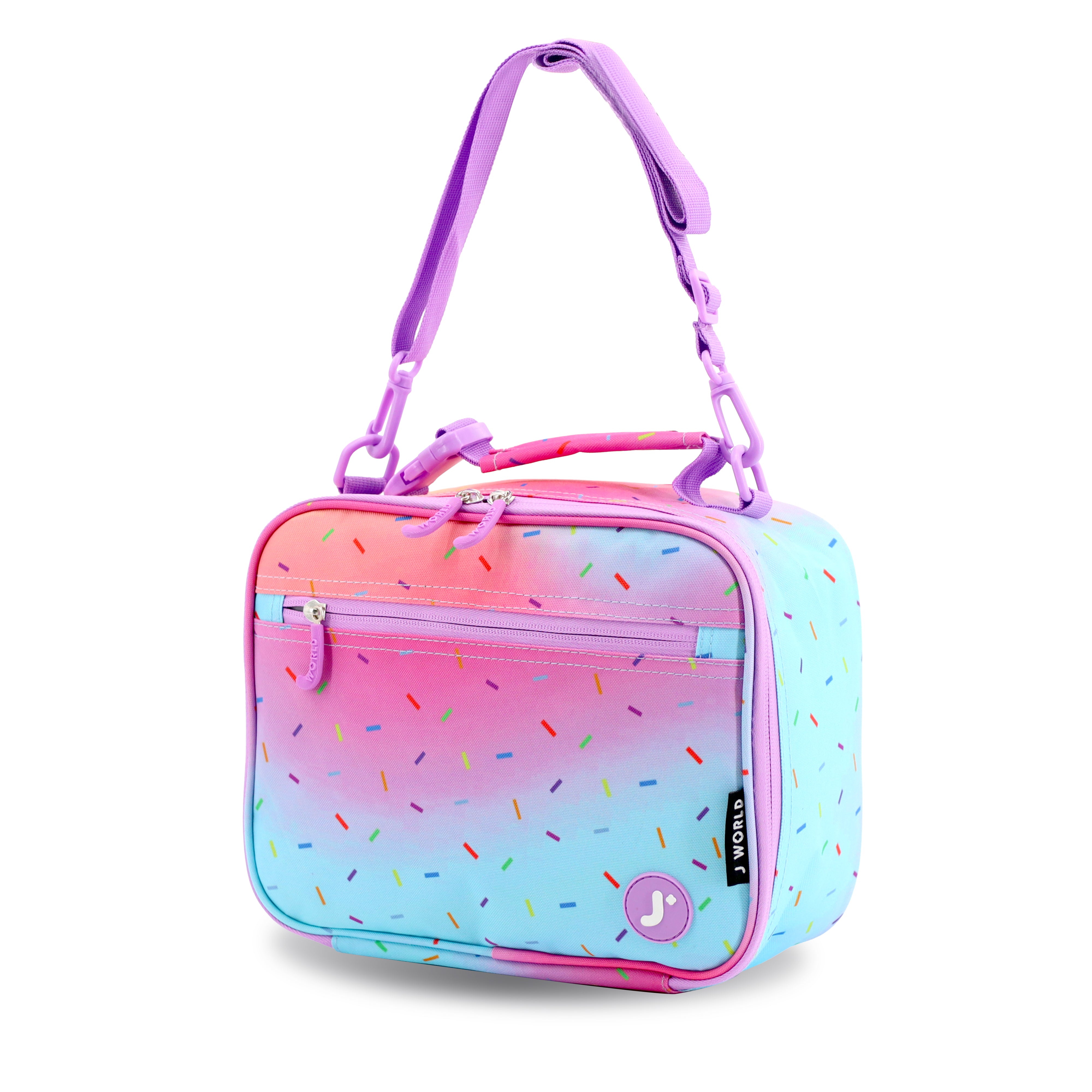 The J World Cody Lunch Bag is a colorful, durable lunch bag perfect for kids. It features a classic rectangular shape with a vibrant allover print, a padded top handle, and an adjustable shoulder strap for easy carrying. The insulated main compartment keeps lunches fresh, and the exterior pocket adds extra storage.
