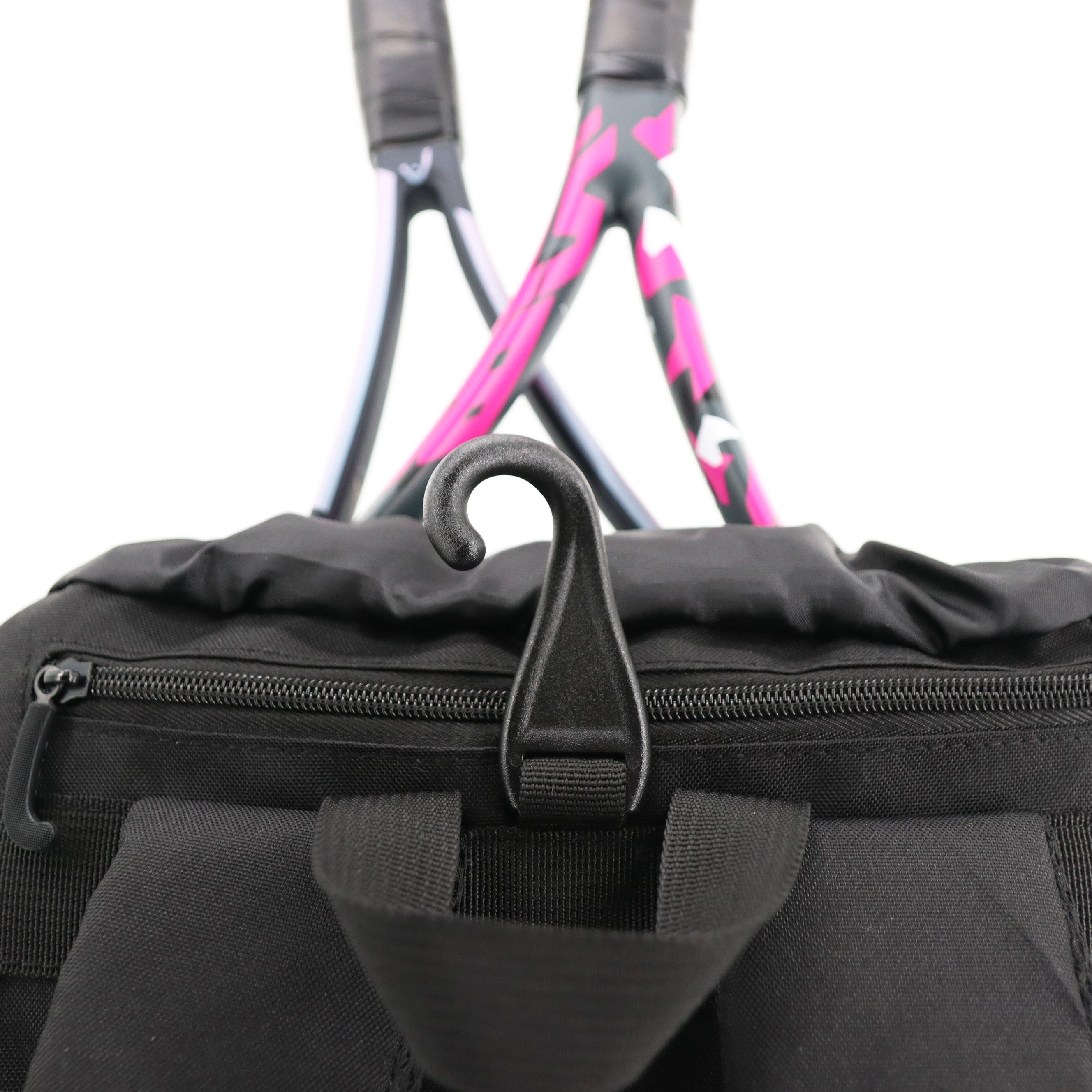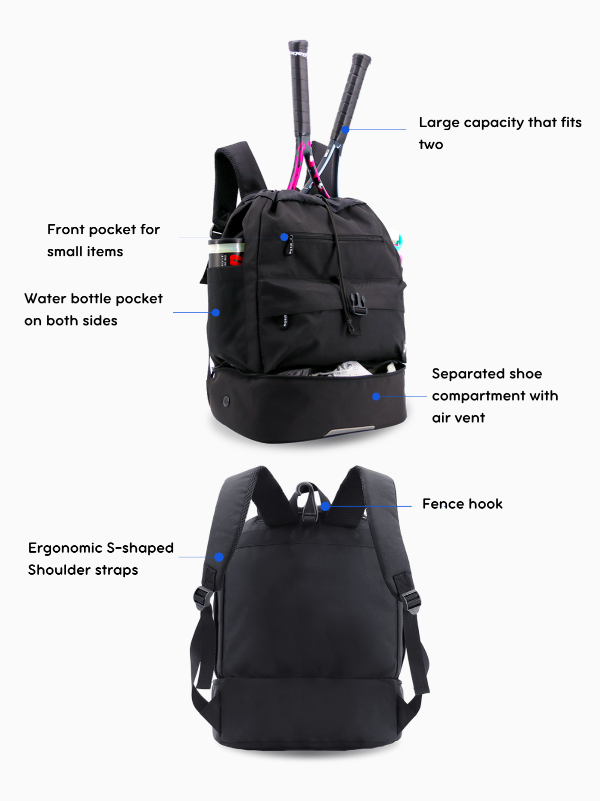 • Ample Storage: Spacious design holds two rackets, clothes, shoes, and more, keeping gear organized.