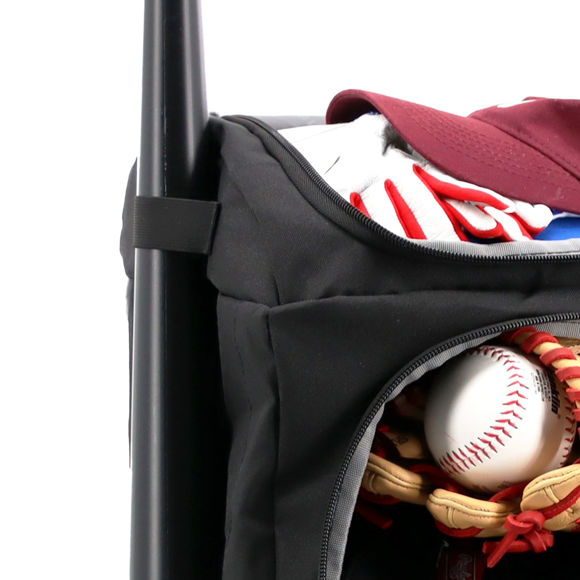 Dual bat holders keep bats secure and easily accessible. Also, top compartment stores clothes, gloves, and accessories easily.