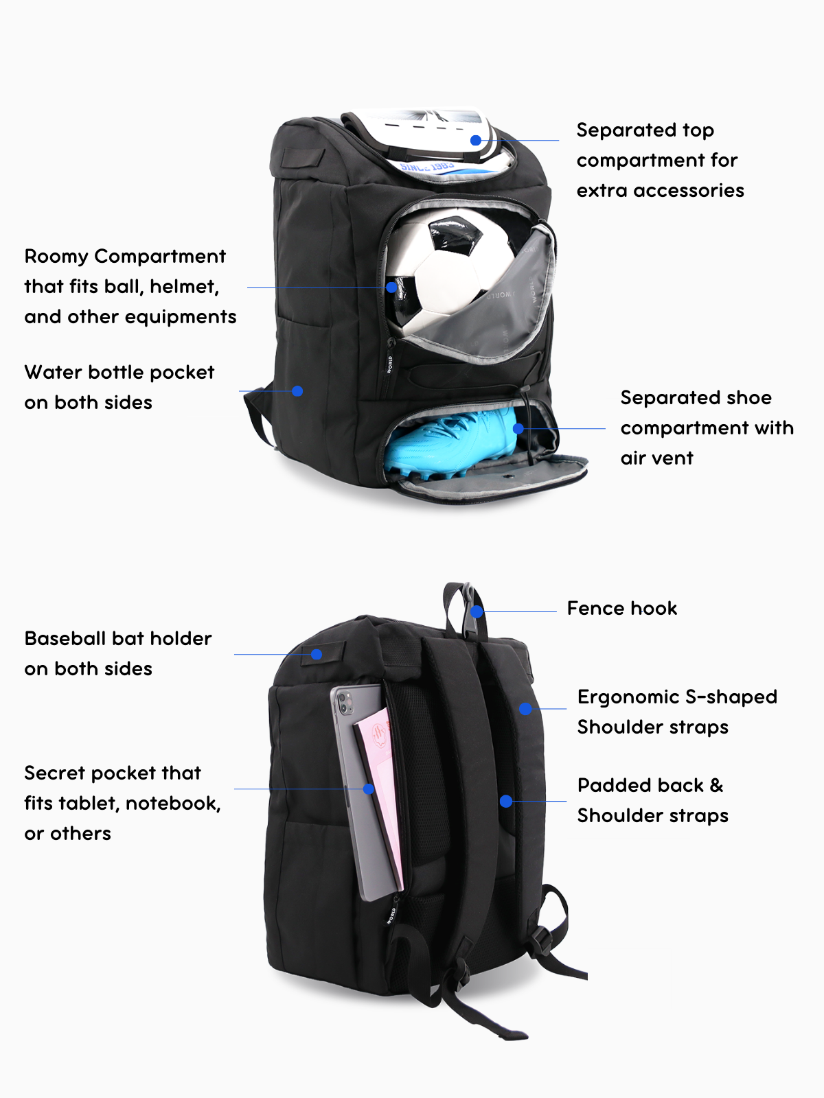 Roomy compartment that fits ball, helmet, gloves, and other equipments. Backpack can be used for soccer, baseball, basketball, football, and any other sports.
