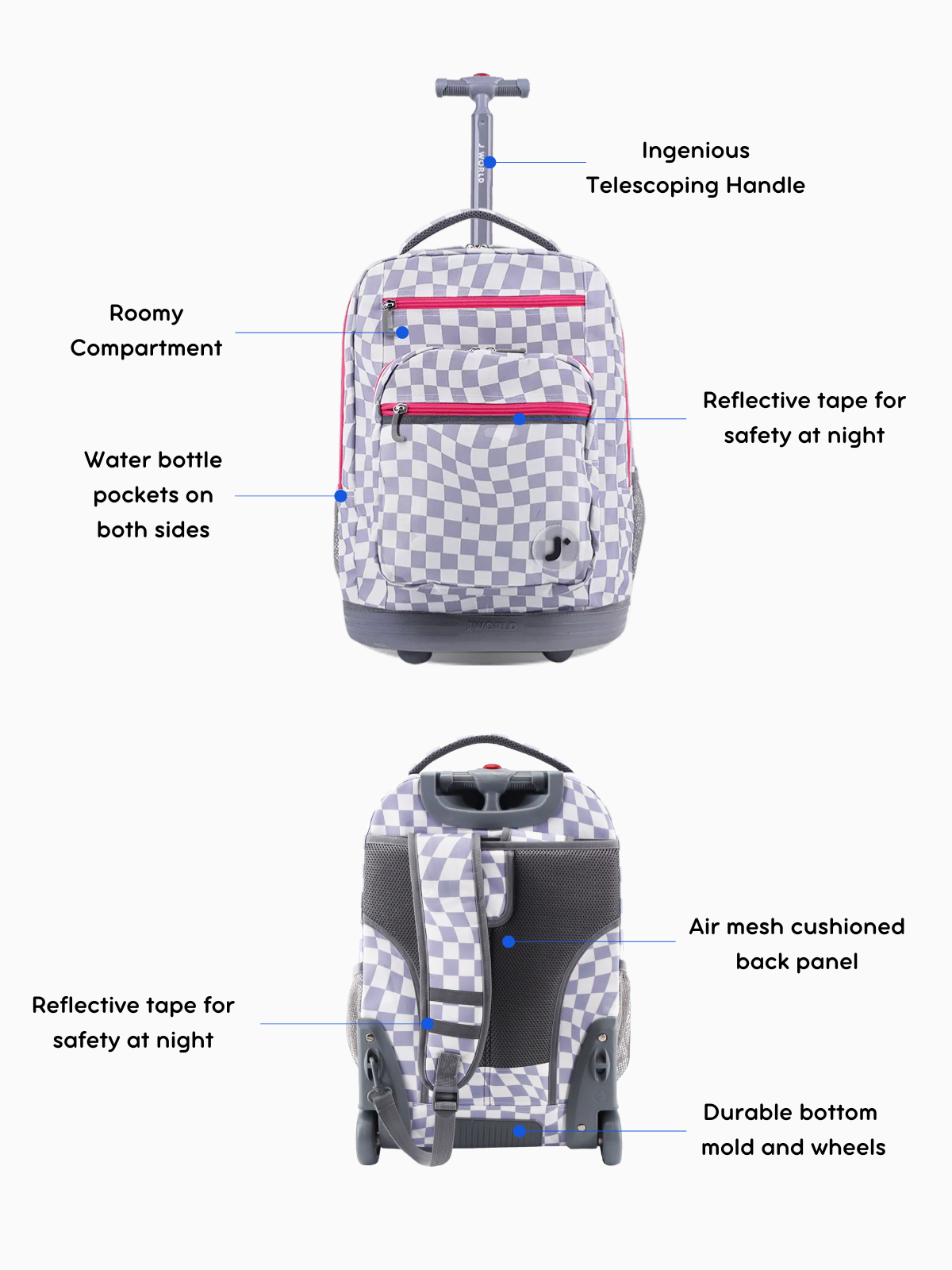 The J World Sundance Rolling Backpack combines style, functionality, and versatility. It features a 15.6" padded laptop sleeve, a bottom protection mold, and ample storage with multiple compartments and pockets. This convertible wheeled backpack offers the convenience of rolling luggage and the portability of a backpack. With an adjustable handle and durable, water-resistant construction, it’s perfect for users of all heights and ensures your belongings stay safe and organized.