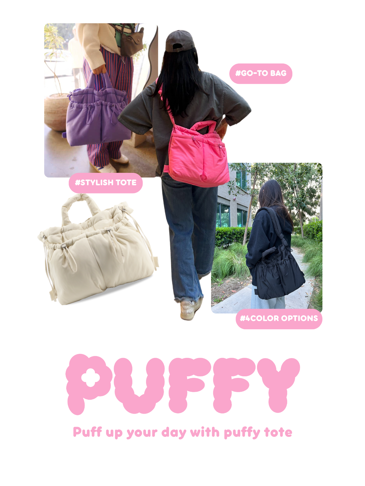 The Puffy Tote is a versatile, stylish bag with adjustable handles for comfort and two front pockets for easy access to essentials. It transforms into a backpack for hands-free use. With a spacious compartment and inner pocket, it fits everything from books to gym gear.