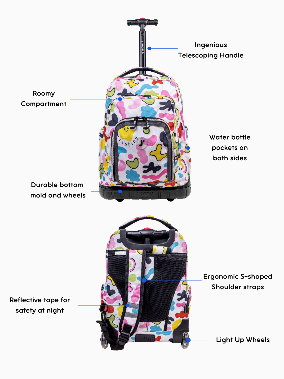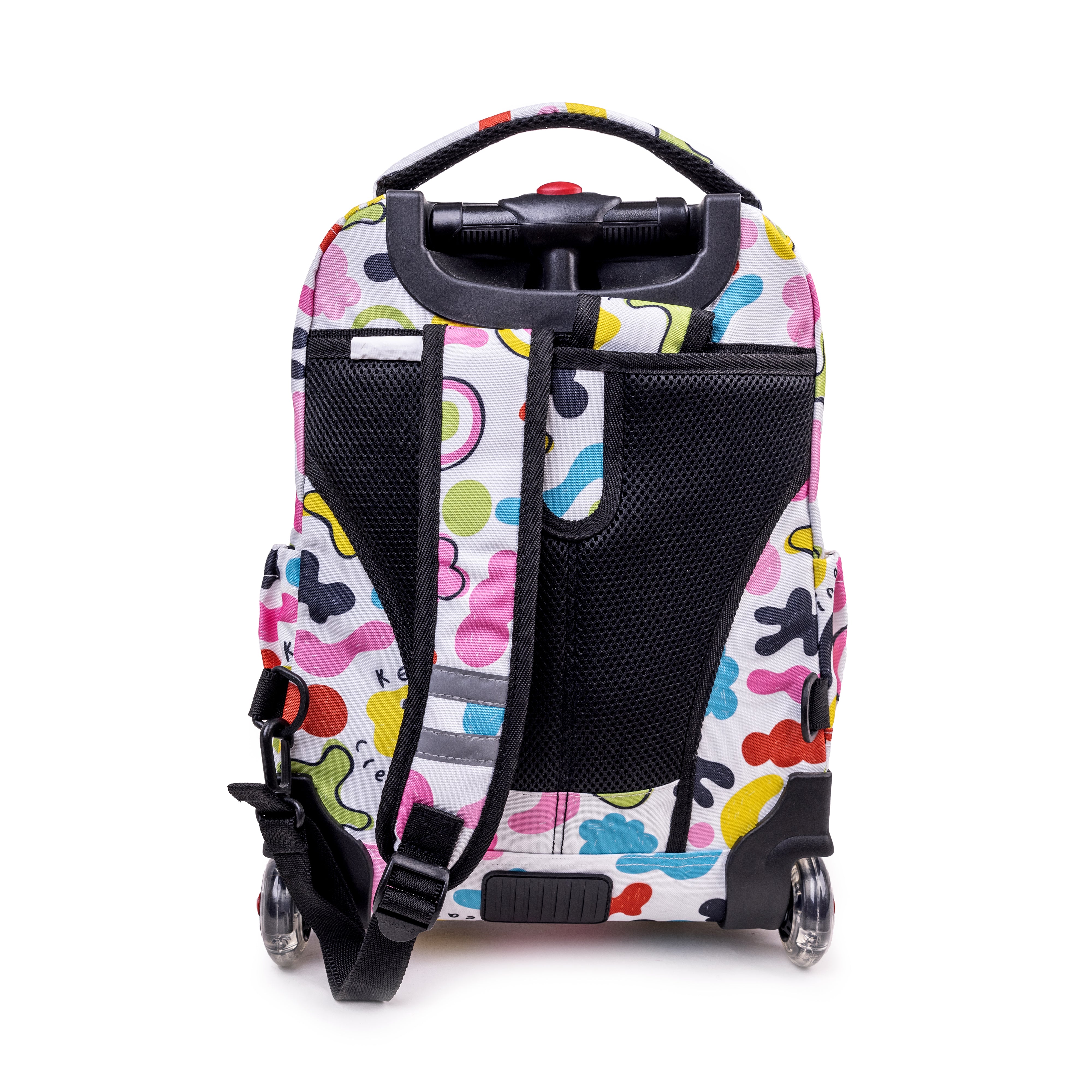 This fun, colorful Lollipop Kids Rolling Backpack With Lunch Bag set includes a wheeled backpack and an insulated lunch bag, designed for kids ages 3-9. The Lollipop Rolling Backpack features soft, noiseless wheels with a magical self-lighting system that kids will love. It includes a three-stage locking handle for easy maneuverability, a spacious main compartment for books and jackets, and an organizer pocket for pencils, keys, and small items. Side mesh pockets are perfect for water bottles, and the set also comes with air mesh cushioned shoulder straps and a padded grip handle for comfort.
